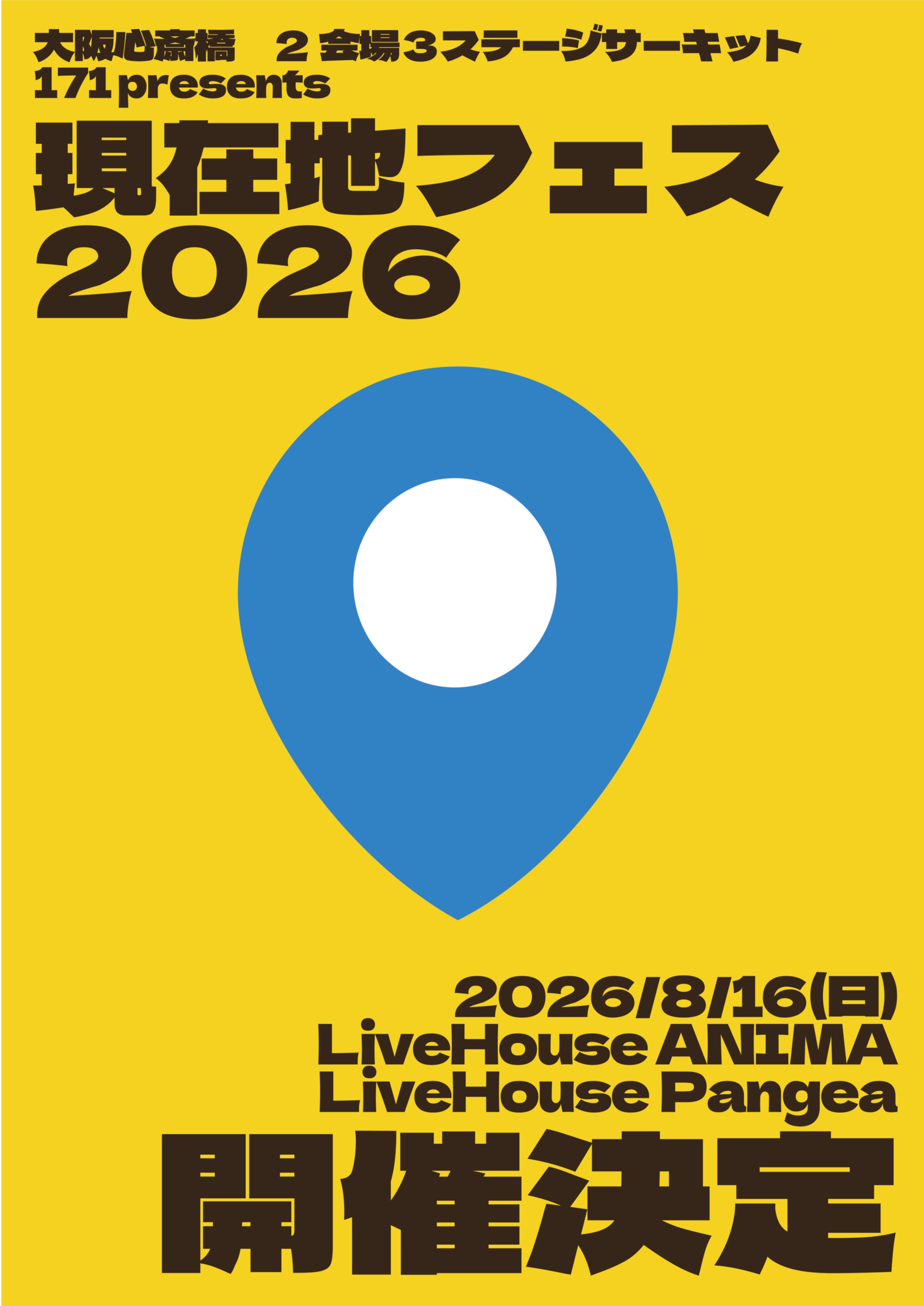 2026/08/16(日) 171 presents 現在地フェス 2026 171 / ...and more OPEN START PRICE +1drink(¥600) PLAYGUIDE 発売日:店頭販売 × メール予約 × ※詳細は後日解禁! 会場:Live House Pangea & Live House ANIMA (2会場3ステージサーキット)