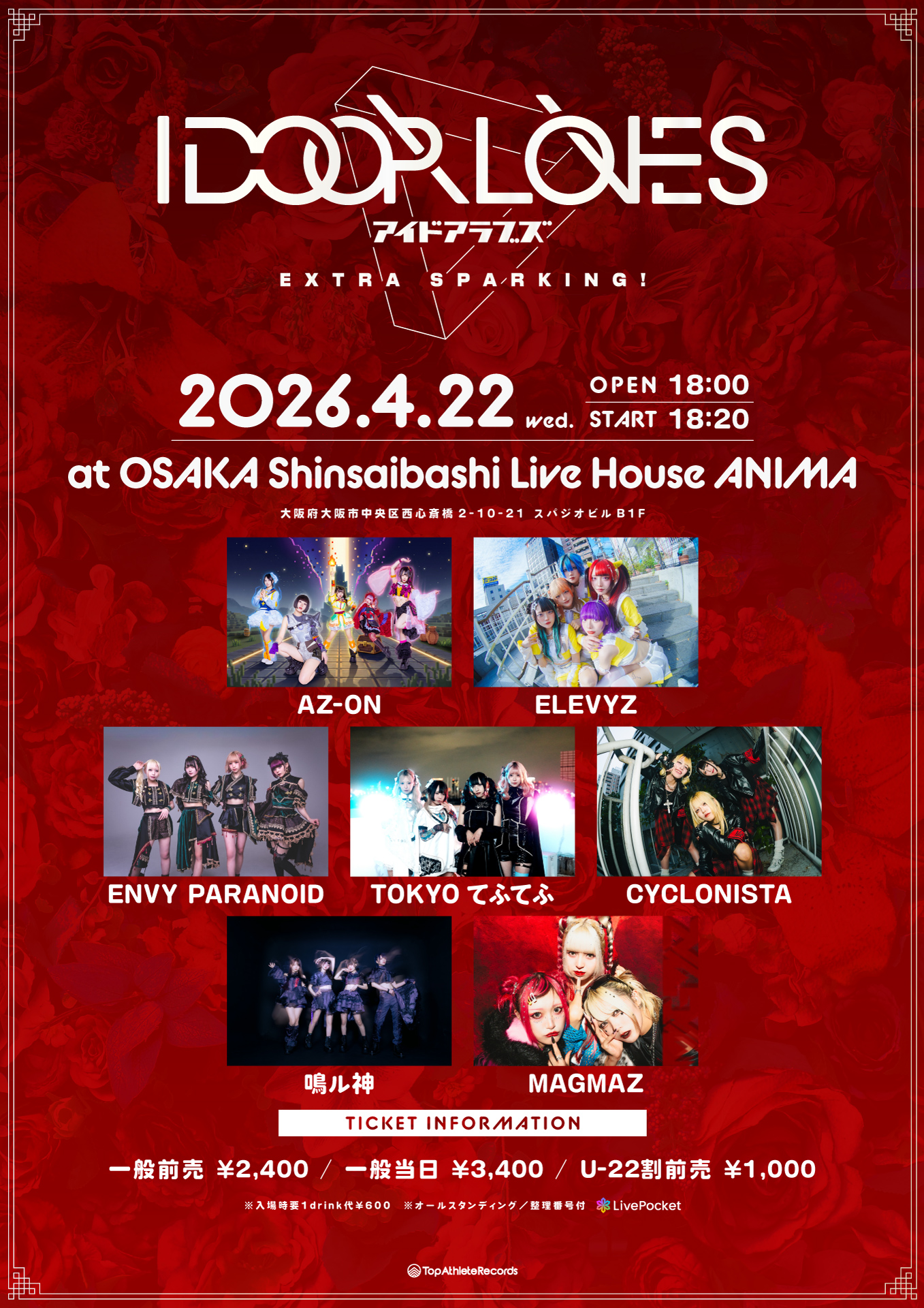 2026/04/22(水) “IDOORLOVES” -EXTRA SPARKING!- AZ-ON / ELEVYZ / ENVY PARANOID / CYCLONISTA / TOKYOてふてふ / 鳴ル神 / MAGMAZ OPEN 18:00 START 18:20 PRICE ADV ¥2400 U-22 ¥1000 DOOR ¥3400 +1drink(¥600) PLAYGUIDE 発売日:発売中店頭販売 × メール予約 × ■券売URL: https://livepocket.jp/e/260422id