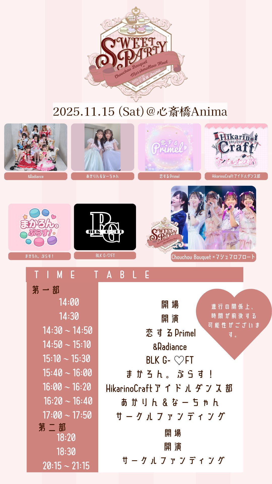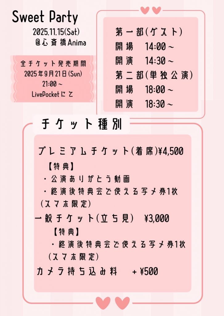 2025/11/15(土) SweetParty 画像参照 OPEN START PRICE 画像参照 +1drink(¥600) PLAYGUIDE 発売日:発売中店頭販売 × メール予約 × ▼チケット https://t.livepocket.jp/e/903-r